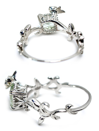 クラシカルなスクエアの石座からあふれ出しそうなグリーンクォーツは、ほのかに甘いローズの蜜をイメージしました。