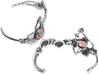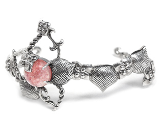 楽園に咲く彩やかな花をイメージしました。チェリークォーツのピンクが妖しい光を放ち、レーザー彫りを施した大胆な花びらが印象的です。