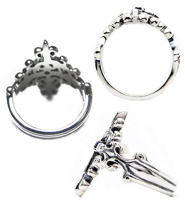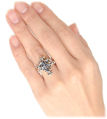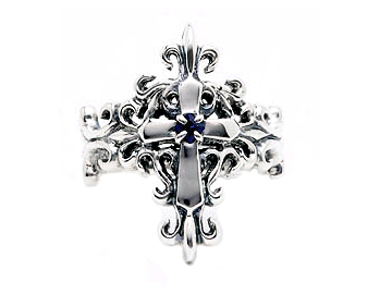 サファイアを留めたクロスを唐草で飾るイブシシルバーリング